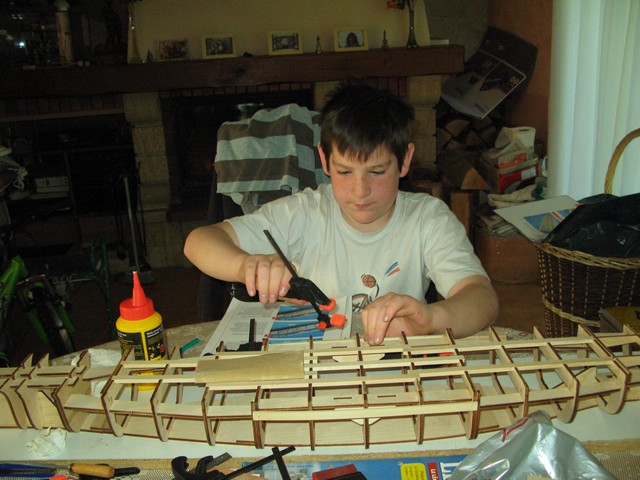 Jean-Paul initia notre jeune modéliste aux joies du cutter, de la poncette et de la colle à bois ! |